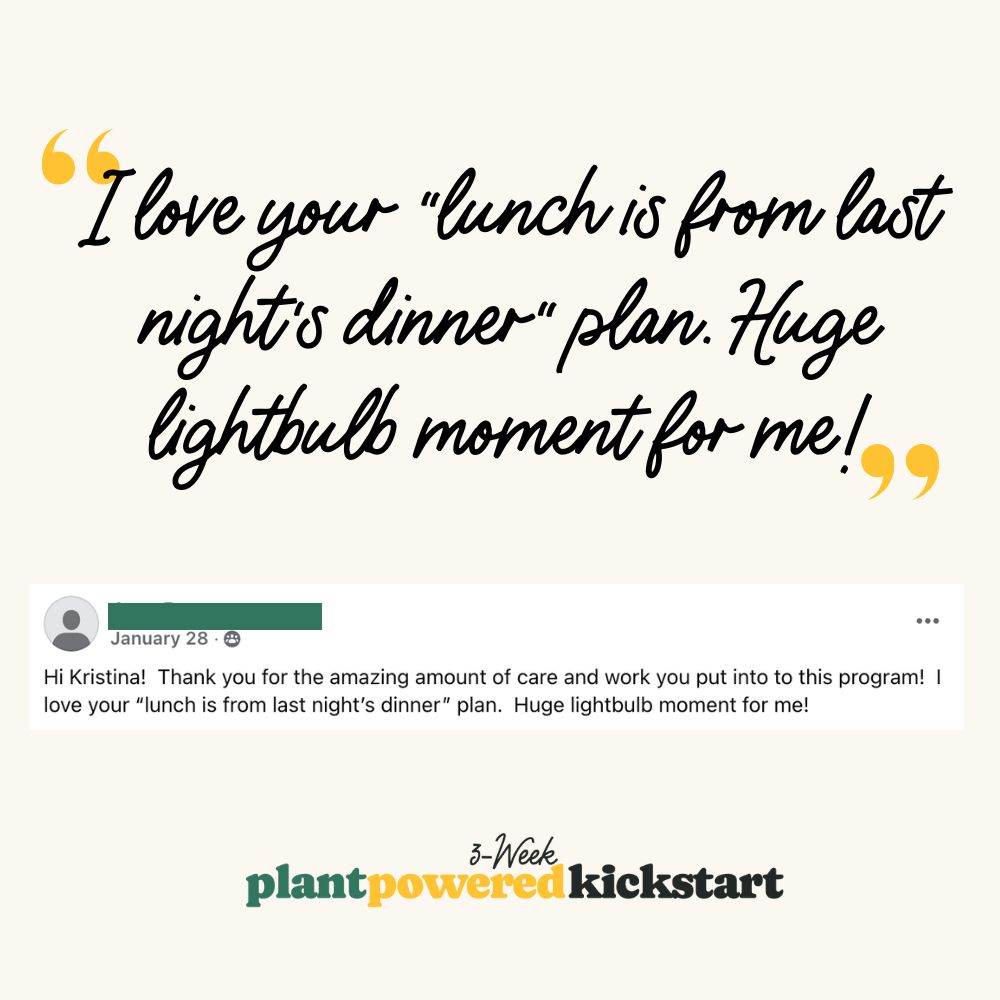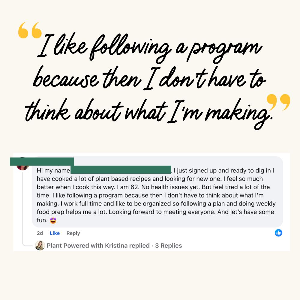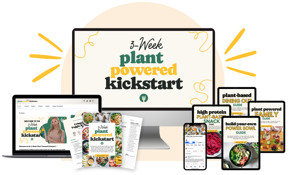 The 3-Week Plant Powered Kickstart is a three-week done-for-you meal plan program for women like you in their 40s, 50s, 60s, and beyond who want to kickstart a high protein plant-based diet so you can support and nourish your body, boost your energy, and maintain a healthy body weight as you age.